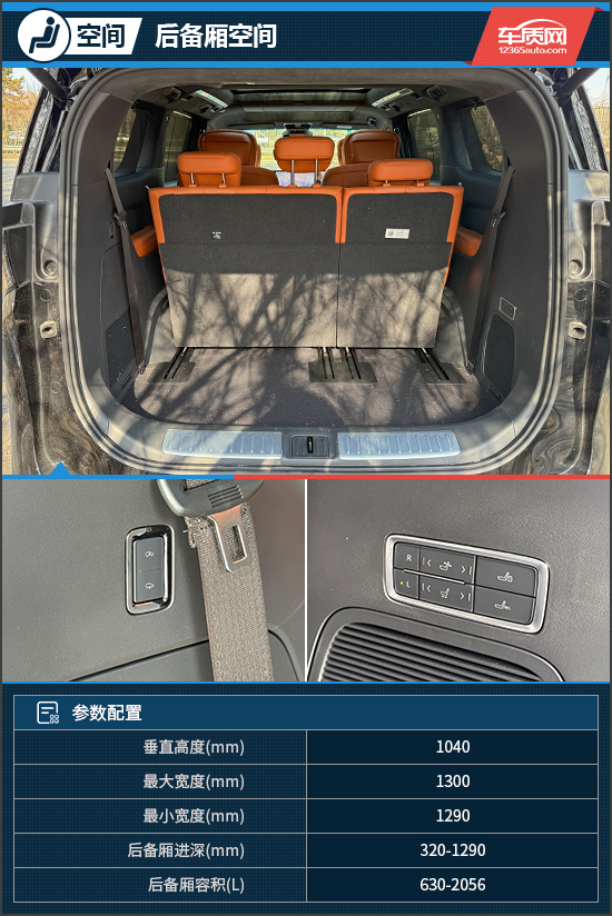 后备厢空间表现同样可圈可点,内部布局规整,常规容积为630L,放倒第三排座椅后可扩展至2056L,无论是大件行李还是露营全套装备,都能轻松装载。此外,左右两侧还提供了车身高度调节和第三排座椅调节的物理按键,操作便捷,实用性很强。