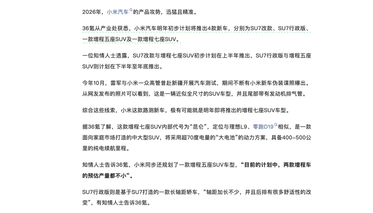 结合此前36氪的爆料来看,2026年,小米或先后推出新一代SU7、SU7行政版、一款五座增程SUV和一款七座增程SUV。