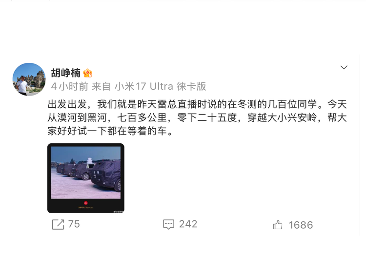 车家号·0浏览·2026-02-02 11:21 · 山东顺为资本投资合伙人—胡峥楠,今早晒了张小米全新车型测试谍照,看体量,像是网传的大型增程SUV。