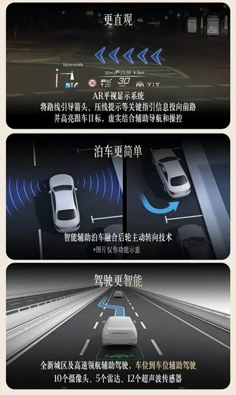 辅助驾驶方面,依托10个外部摄像头、5个雷达传感器以及12个超声波传感器等,可以实现车位到车位的高阶智能驾驶 。借助后轮转向技术,将支持斜向与无划线车位识别的智能泊车。