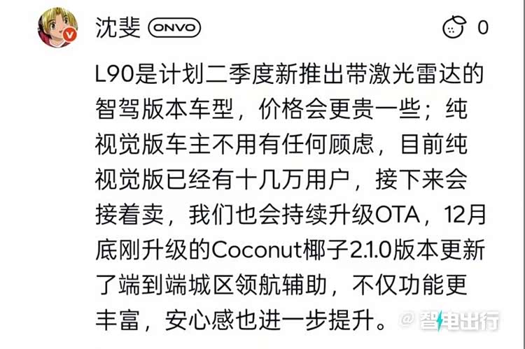 但选装激光雷达不是L80的专属,在今年二季度乐道也会带来搭载激光雷达的L90。蔚来高级副总裁兼乐道汽车总裁沈斐表示会比现在的车型贵一点,但是采用视觉融合方案的车型也会继续同步销售,大家可以按需选择。