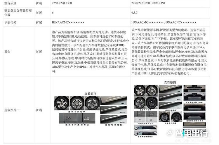 这就是乐道L80,一台跟L90尺寸轴距一模一样的“新车”。它的申报方式不是在工信部里单开一个新车型,而是作为L90的补充申报。在选装图片里面能看到标识的选择,并且还带来了新的轮辋样式和车标样式等可供选择。