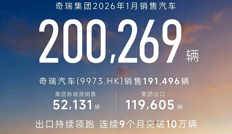 根据奇瑞集团公布的销售数据显示,2026年1月份奇瑞集团总销量达到200269台,其中,新能源汽车月销52131台;海外出口销量119606台,同比增长48.1%,这已经是奇瑞集团连续9个月实现出口超10万台。