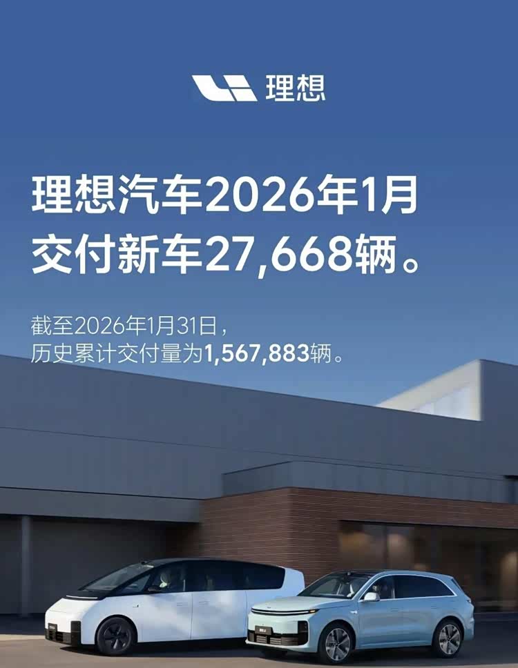 理想汽车交付27668辆,同比下滑7.55%。作为曾经的新势力销冠,理想开年延续调整态势,纯电转型与产品迭代节奏仍待观察。