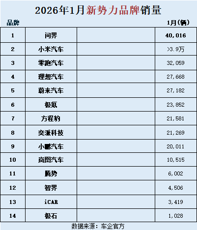 整理官方所发布的数据,2026年1月交付量破万的新势力品牌有十家,其中高居榜首的是鸿蒙旗下问界汽车,1月交付量达到了40016辆,也是1月唯一一个交付量破4万的品牌。