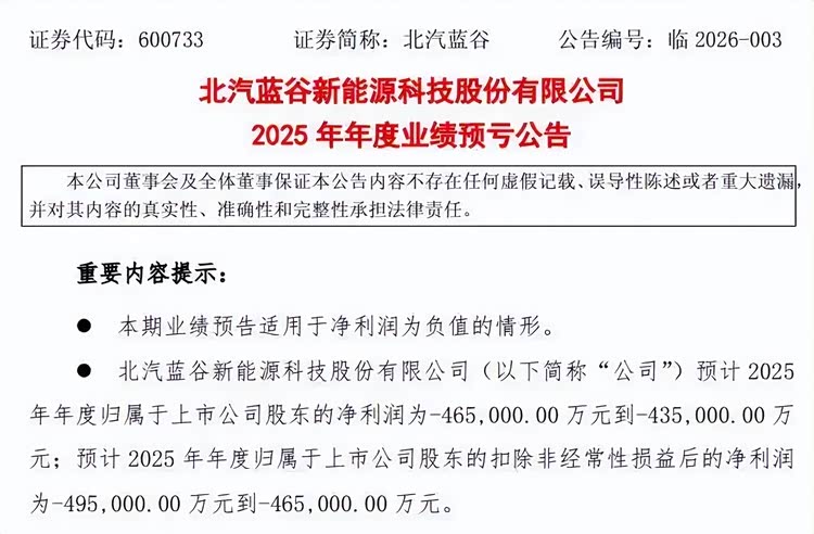 1月19日,北汽蓝谷发布2025年业绩预告,全年归属于上市公司股东的净亏损约为43.5-46.5亿元,与2024年相比减亏幅度达到33.09%-37.41%,亏损规模显著收窄。