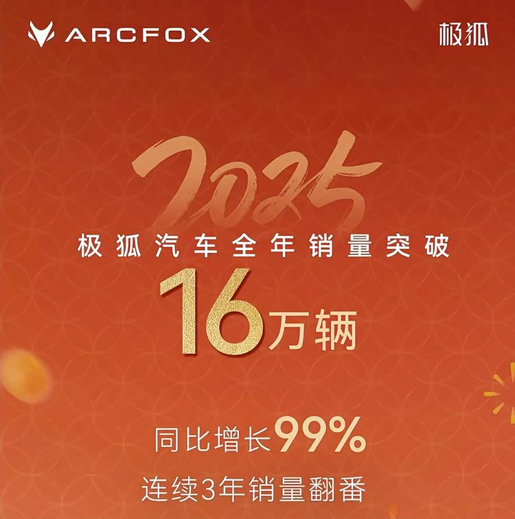 2025年全年,极狐品牌销量突破16万辆,连续3年实现销量翻番(2023-2025年),其中12月份单月销量更是突破2.4万辆,同比增长103%,这已经是极狐品牌连续3个月月销2万辆以上。