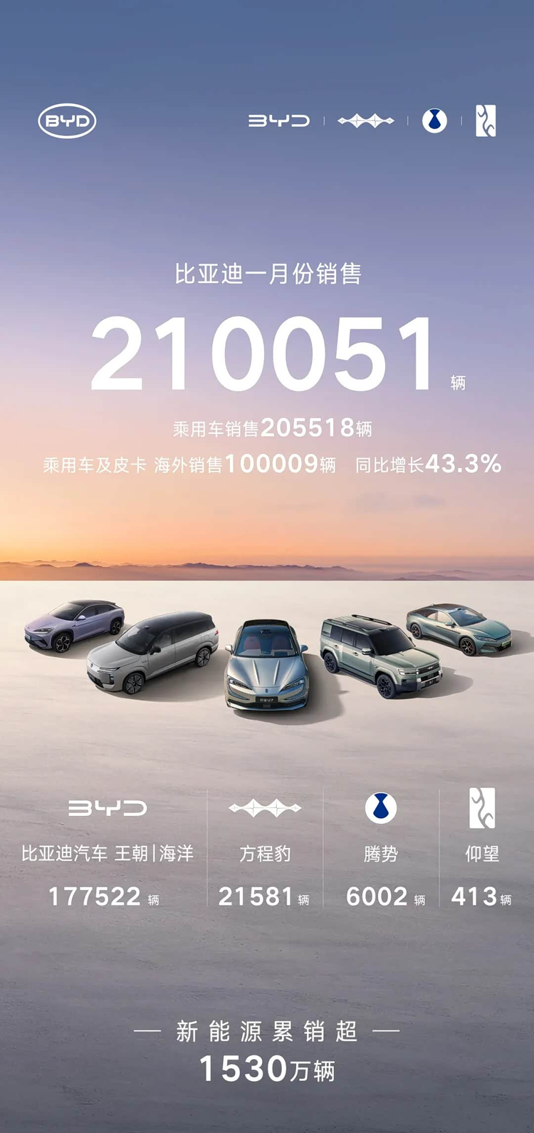 比亚迪近日发布了今年1月的销售数据,整体表现呈现一定增长态势。从公布的信息来看,公司在1月共销售新车210051台,其中乘用车部分为205518台。海外市场方面,乘用车及皮卡出口达到100009台,相比去年同期增长了43.3%。至此,比亚迪在新能源领域的累计销量已超过1530万辆。