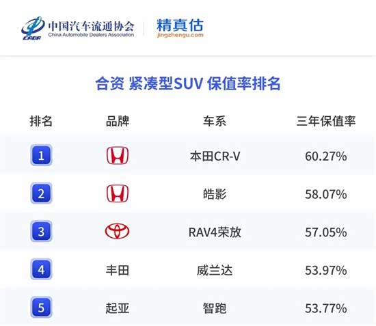 在这场关于价值的终极拷问中, 东风本田CR-V(参数|询价)再次交出了一份令人侧目的答卷:在最新的中国汽车流通协会保值率报告榜单中,CR-V再度蝉联合资紧凑型SUV保值率冠军,其三年保值率依然坚挺地站在60%以上的高位。这不仅是数字的胜利,更是市场对“买SUV必看CR-V”这一理性共识的再次确认。