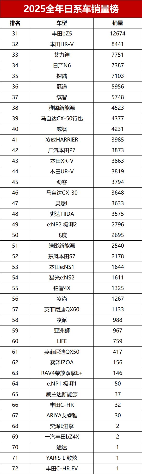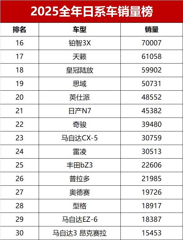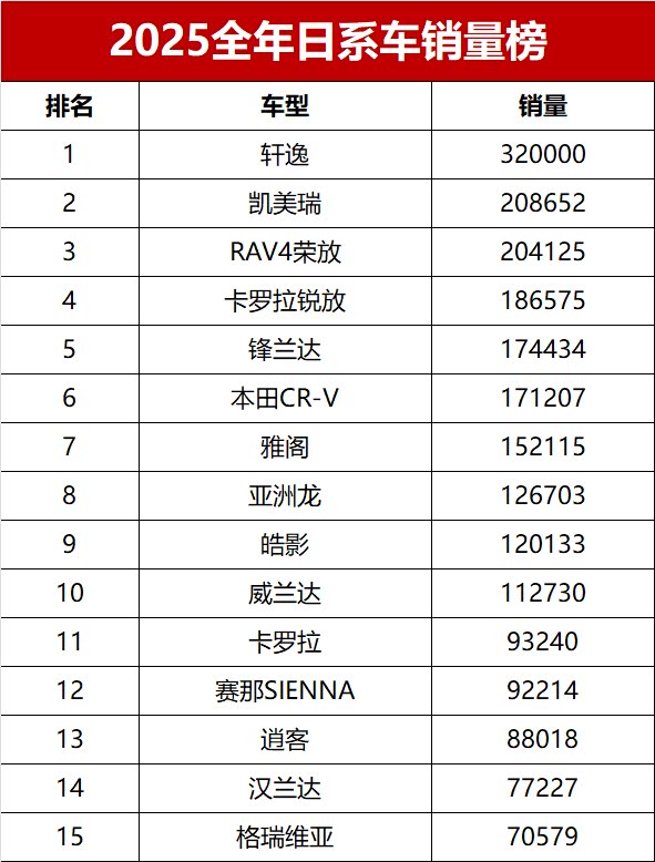 【2025年全年日系车零售销量排行榜】乘联会最新数据出炉,2025年日系车全年零售销量定格在288.6万辆,同比下滑7.9%,市场份额也进一步缩水至12.2%,比2024年少了1.5个百分点。反观整个国内乘用车市场,2025年全年零售销量达2374.5万辆,同比还涨了3.8%。一边是整体市场的稳步增长,一边是日系车的持续下滑,两者形成鲜明对比,不难看出,曾经在国内市场叱咤风云的日系车,如今的竞争力正不断减弱,“合资霸主”的光环也早已不如以往。真惨!2025全年日系车零售榜! 本田CR-V(参数|询价)第六,卡罗拉跌出前十!