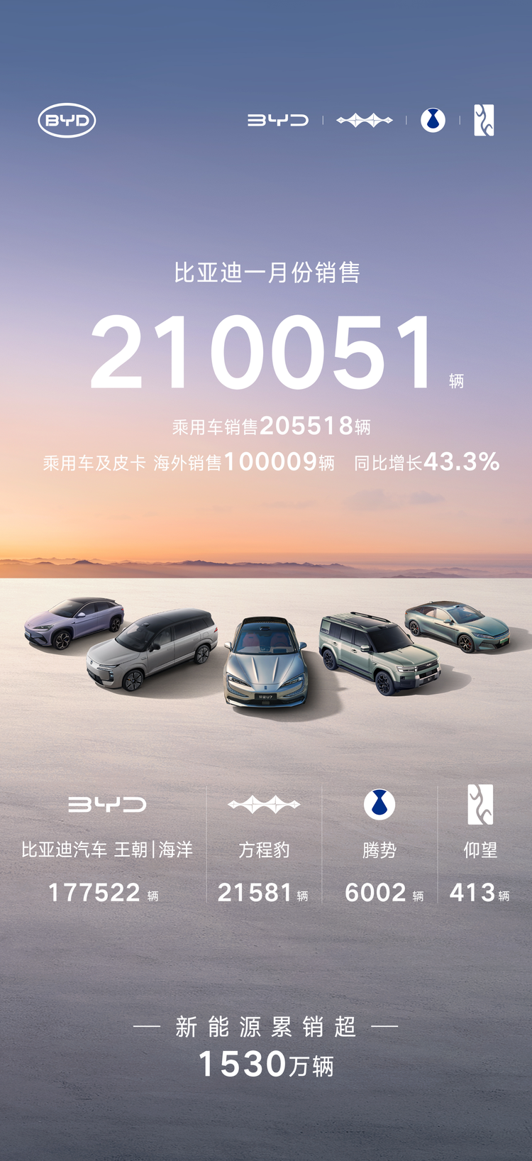 先唠销量硬数据,比亚迪1月以210051辆蝉联国内新能源销冠,累计销量破1530万辆,妥妥的行业风向标。