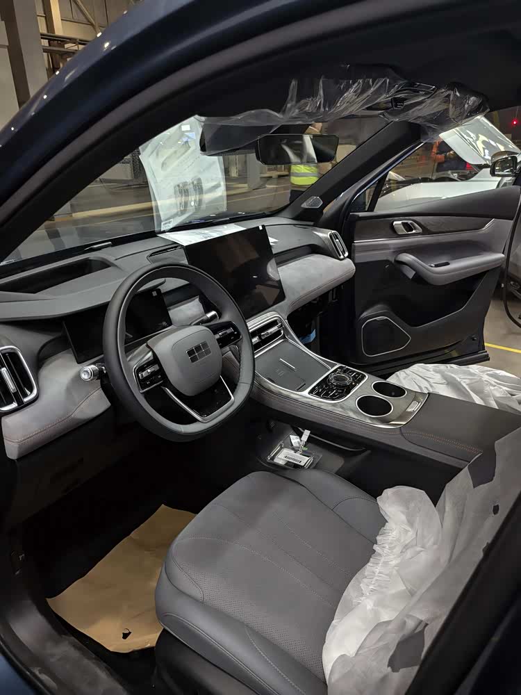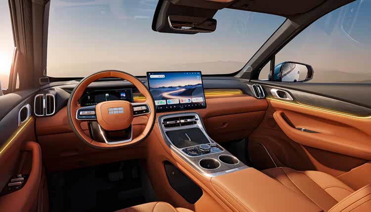 在材质与细节上,车内提供了橙色皮质与灰色麂皮等多种风格选择,并辅以镀铬饰条、木纹饰板以及水晶质感饰件进行点缀,配合氛围灯的烘托,营造出不错的豪华感受。新车还换装了与银河M9同款的多功能方向盘和电子怀挡,中控台下方的镂空副仪表台设有手机无线快充区域,并配备一体式运动座椅与Flyme Sound音响系统。