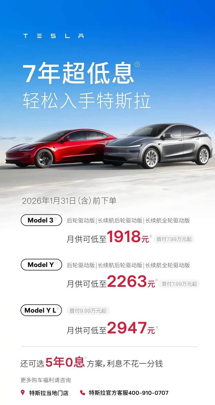 率先发起这场“金融战”的是特斯拉。2026年1月6日,特斯拉中国为购买Model 3和Model Y、 Model Y L(参数|询价)车型提供5年0息方案,同时推出了7年超低利息方案。其中,Model 3/Y首付7.99万起,月供可低至1918元;Model Y L首付9.99万起,月供可低至2947元。
