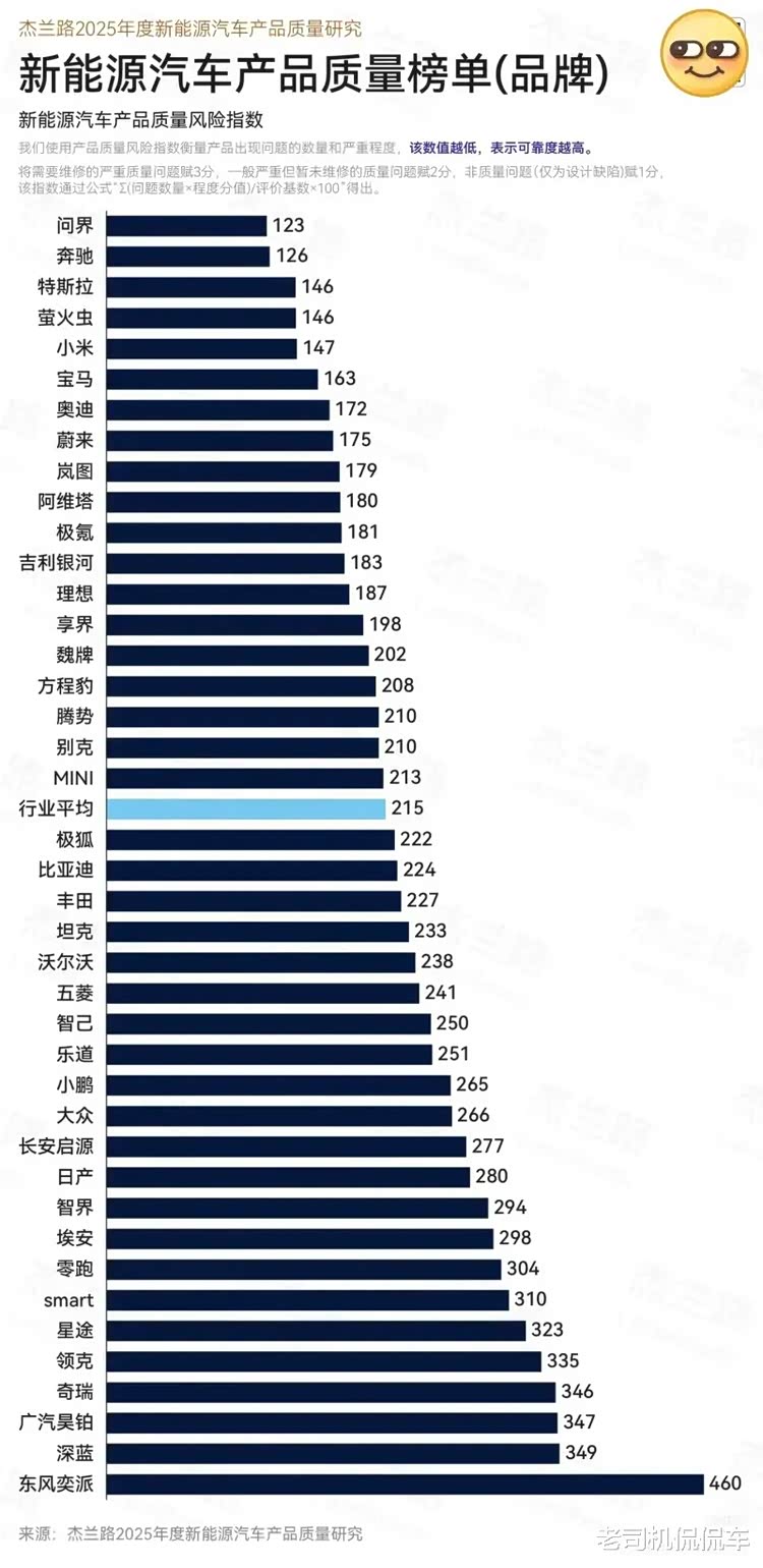 1月29日,独立汽车数据分析机构杰兰路发布《2025年度新能源汽车产品质量研究》。该研究覆盖57个品牌、回收有效样本超5,700份,聚焦车主拥车2-12个月内的真实体验,系统梳理了6,950项质量问题与设计缺陷,从这个样本量来看,还是有一定的说服力的。
