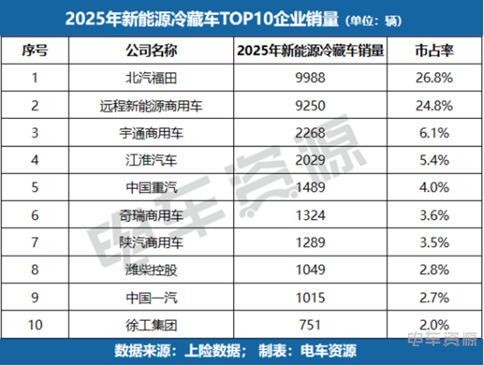 新能源冷藏车市场目前的竞争格局已呈现明显的头部集聚特征。2025年,北汽福田以9988辆的销量和26.8%的市占率位居行业第一,远程新能源商用车以9250辆的销量和24.8%的市占率紧随其后,两家企业合计占据51.6%的市场份额。