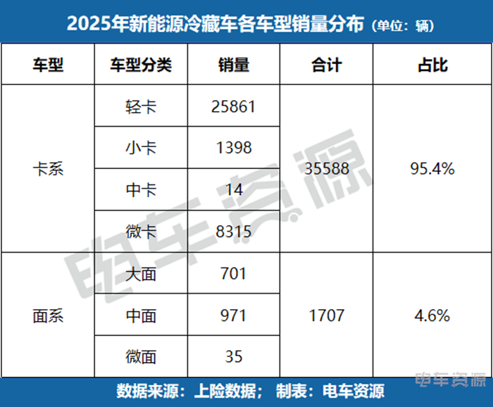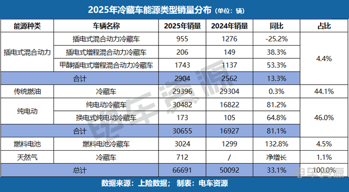 根据电车资源统计,2025年我国冷藏车(总质量4.5吨以下轻商物流车)销量约6.7万辆,同比增长33.1%。值得关注的是,新能源冷藏车在这块不断变大的“蛋糕”中占据了半壁以上江山,其以3.7万辆的销量实现了55.9%的市场占比,同比增长79.4%,成功超越传统燃油冷藏车,这一历史性拐点的出现,标志着市场驱动力的根本转换。