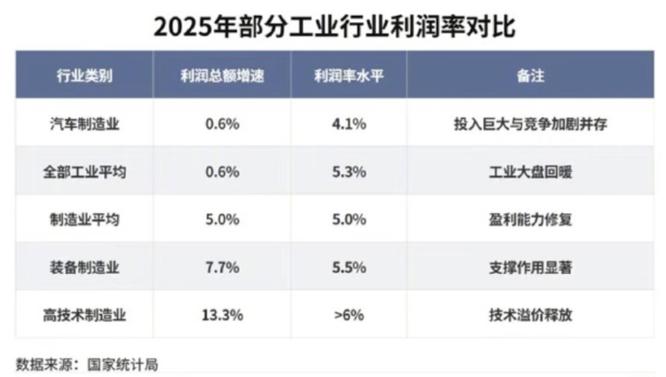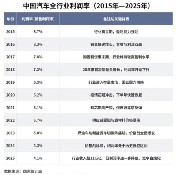 1月27日,根据国家统计局发布的“2025年全国规模以上工业企业经营数据”来看,2025年中国汽车行业的全年产量虽然增长了10%,达到了3478万台;营收也同步增长了7.1%,达到了11.18万亿元。但4610亿元的总利润仅增加了0.6%,全行业利润率降至了4.1%,为十年来的最低值。