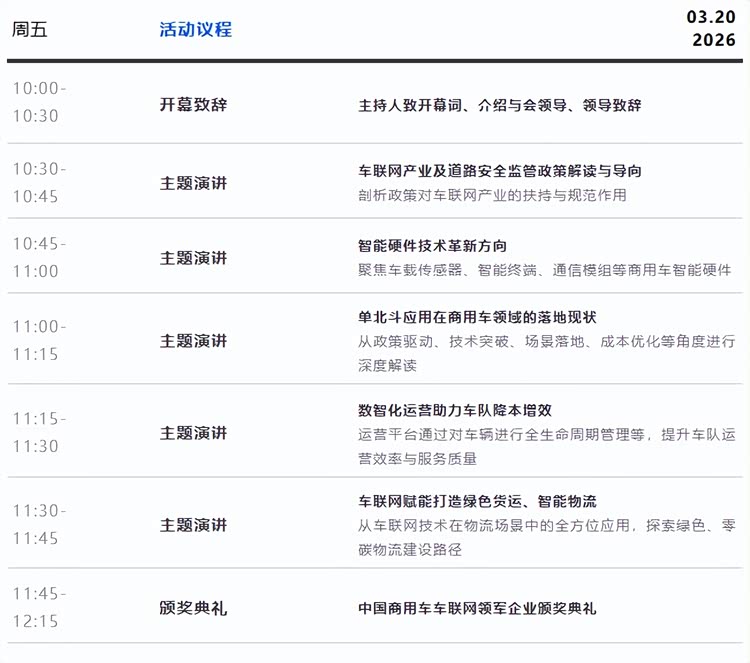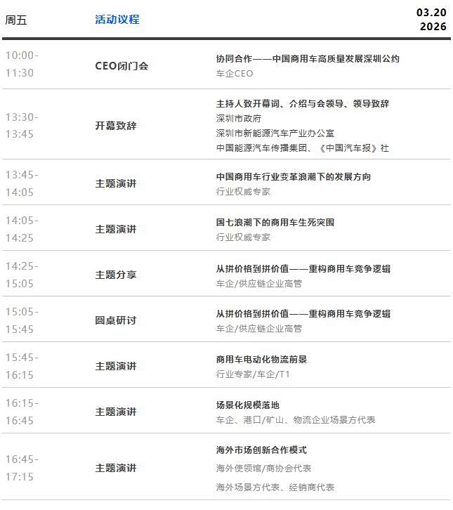 2026商用车创新论坛,以“以东方引擎 澎湃世界转型之路”为主题,围绕中国商用车发展现状及未来趋势,聚焦内需疲软、无序竞争对产业链的不良影响、技术路线探讨、场景应用差异化需求、创新合作模式等话题,汇聚商用车行业权威专家、整车企业、海外商协会/经销商、头部供应链配套企业、港口集团、物流货运企业等专业人士,推动商用车行业从价格竞争转向可持续发展,打造商用车产业高端对话平台!