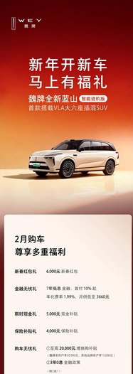 进入春节前后的传统购车周期,魏牌针对蓝山推出了一轮覆盖金融、现金与置换多维度的新春购车方案,核心目标指向家庭用户的“增购”和“换购”需求。从实际结构来看,这一轮政策并非单一价格刺激,而是通过金融周期拉长、首付门槛下探以及多项补贴叠加,降低中大型新能源SUV的整体进入成本。