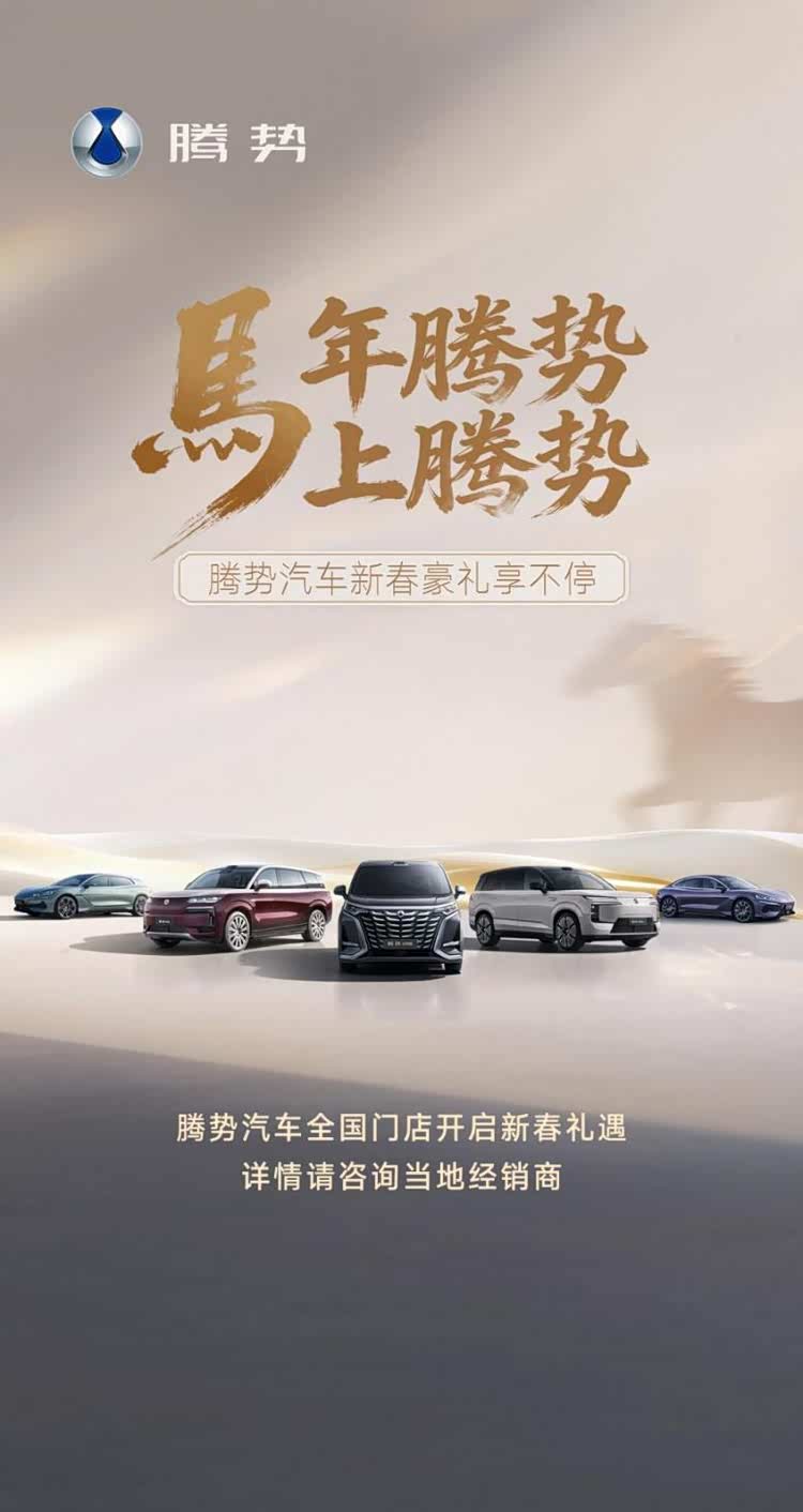 马年腾势,马上腾势,腾势汽车新春豪礼享不停。近日,腾势汽车正式推出2026年2月限时购车权益,活动覆盖腾势N9、腾势D9、腾势N8L、 腾势Z9GT(参数|询价)等全系车型,以诚意拉满的新春红包与丰富实用的礼遇,打造新春购车最优时机,助力更多家庭与精英人士开启高品质出行新旅程。即日起至2026年2月16日,腾势汽车全国门店开启新春礼遇,机会难得,更多详情请咨询当地经销商。