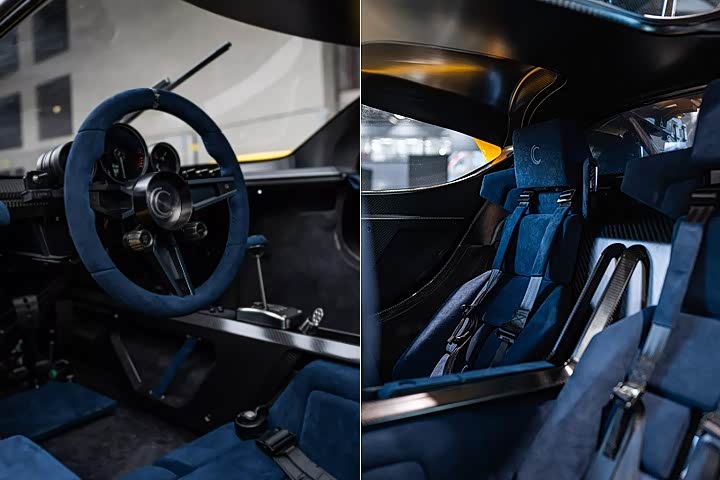 座舱内,Capricorn 01 Zagato 则是保留了机械感的工业美学,配备实体仪表板、极简风格的附模式选择按钮之三辐式方向盘和换档杆,以及一对紧贴引擎式防火墙的赛车座椅,搭配蓝色的麂皮和碳纤维饰板。