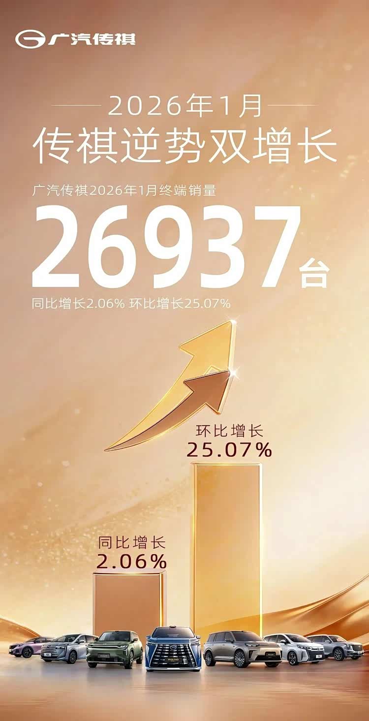 按照产销快报上的数据来看,2026年1月广汽埃安销量为21,635辆,同比增长171.63%;广汽丰田销量为62,600辆,同比增长9.82%;广汽传祺销量为27,684辆,同比增长51.06%。