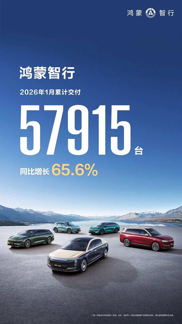 许多人关注的鸿蒙智行在1月的表现相当不错,2026年1月鸿蒙智行累计交付新车57,915台,同比增长65.6%。