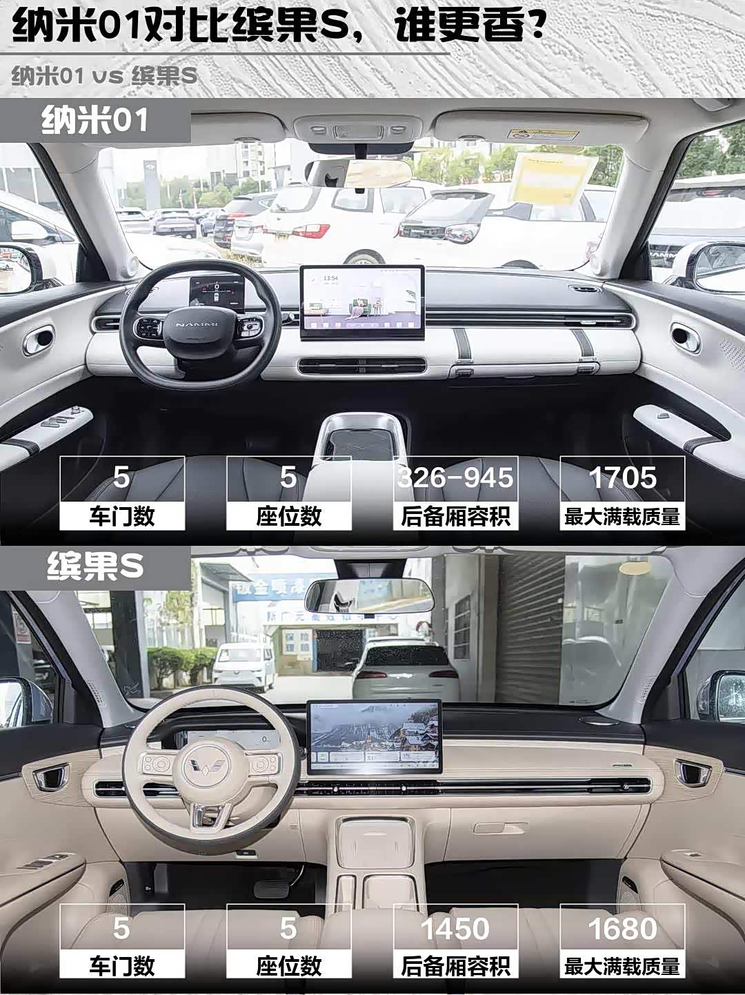 纳米01后备厢326-945L灵活多变,副驾抽屉式岛台设计超贴心,女生放化妆品超方便!缤果S后排座椅放平后容积达1450L,露营装备随便装。但纳米01的无框车门和迎宾模式仪式感拉满,停车场回头率爆表~