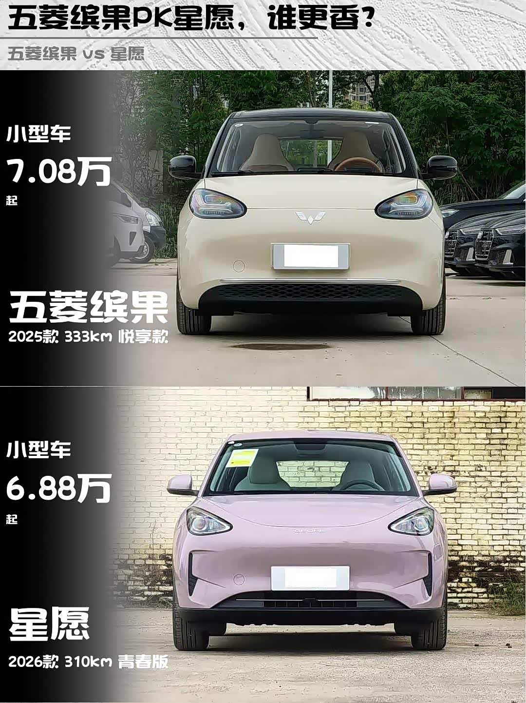 最近在帮朋友选8万级纯电代步车,深度对比了 五菱缤果(参数|询价)2025款333km悦享款和星愿2026款310km青春版,发现这两款车简直是性格迥异的"优等生"!🔥