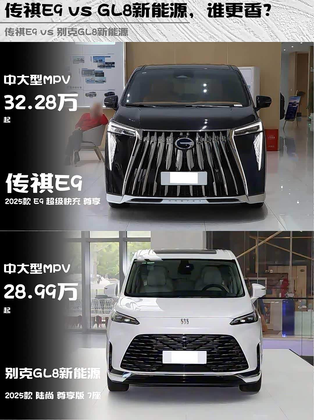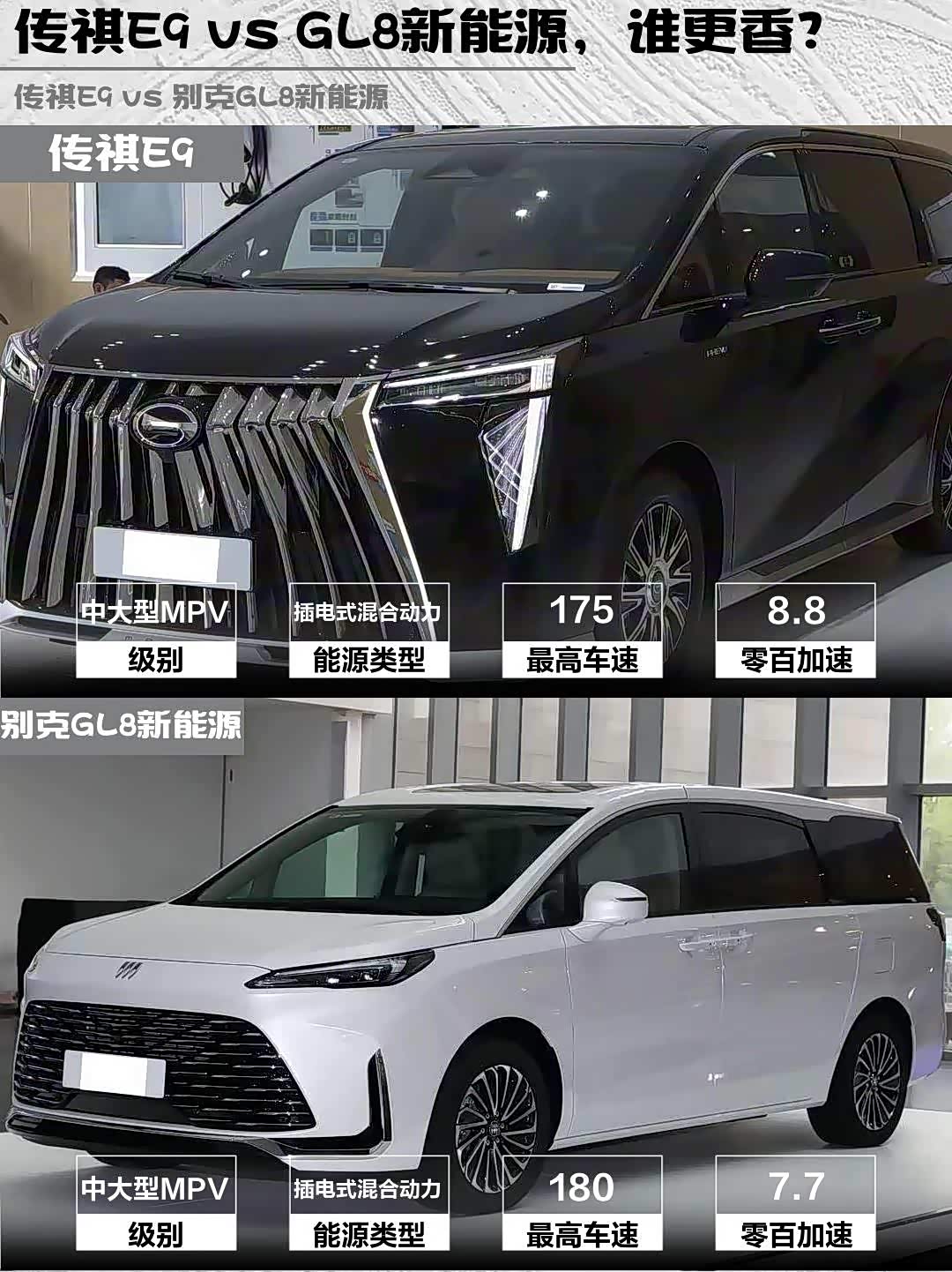 最近在选MPV的朋友看过来!👀 今天深度对比两款热门插混MPV——传祺E9 2025款超级快充尊享版 vs 别克GL8新能源(参数|询价) 2025款陆尚尊享版7座,实测干货直接上!🔥