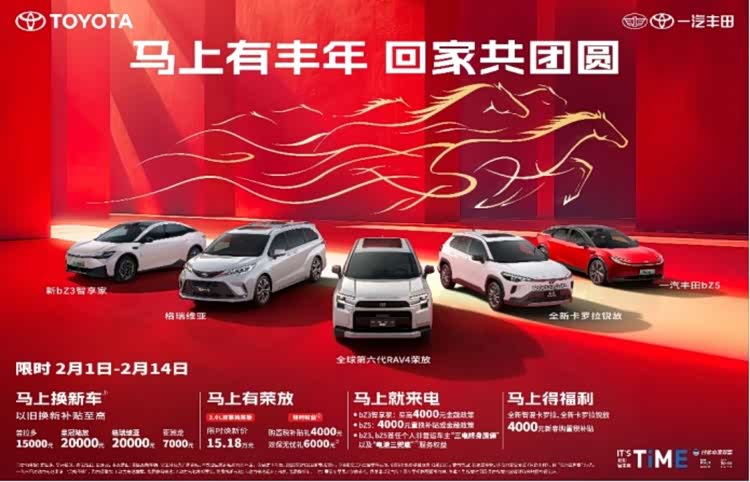 年味渐浓,归途可期。一汽丰田以一份诚挚礼遇,守护每个家庭的团圆之旅。2月1日至2月14日,一汽丰田推出限时活动,皇冠陆放、格瑞维亚等明星车型享至高20000元的置换补贴;全新第六代荣放限时焕新价15.18万元起,并可享4000元的购置税补贴和6000元的双保无忧礼;纯电“双子星”bZ3智享家和bZ5至高享4000元购车补贴和“三电终身质保”“电池三兜底”的服务权益;全新智混卡罗拉、全新卡罗拉锐放也可享4000元新春购置税补贴。