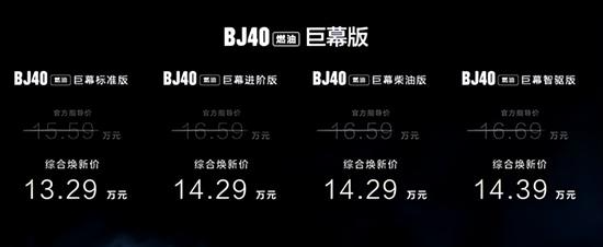 1月27日,2026款北京越野BJ40燃油巨幕版正式上市,新车共推出4款配置,官方指导价15.59-16.69万元,综合焕新价13.29-14.39万元。同时,官方还推出了全系7重礼。作为新增车型,其主要针对配置进行了升级。
