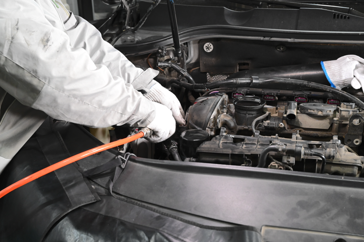 把车举起来,能看见漏出的机油随风飘洒,让底盘变得油糊糊,有时甚至还会漏到排气歧管上烧出糊味。