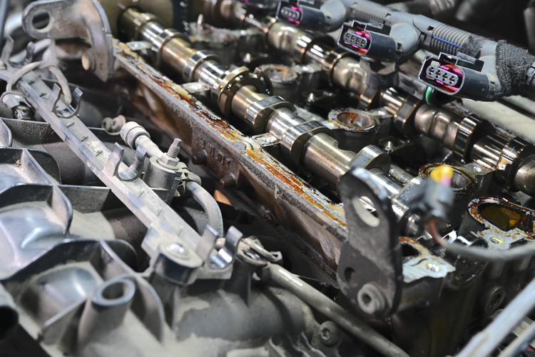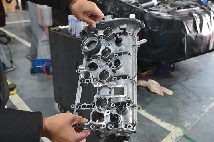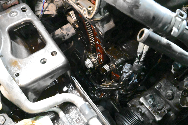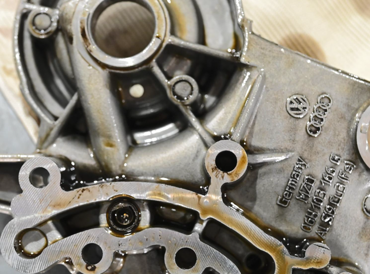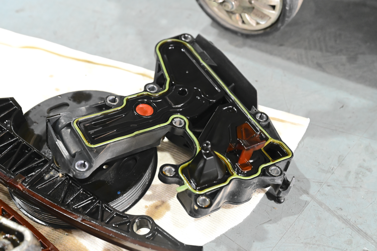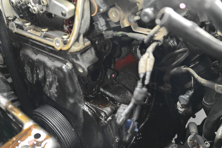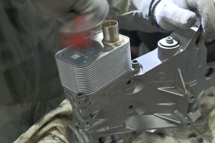 技师发现,它不仅凸轮轴密封圈、高压油泵、废气阀都已经开始漏油,老生常谈的气门室盖也因为密封件老化渗出油渍,就连机油盖密封圈也失效了。而机油散热器,也是最严重的漏油点,就能看见机油滴挂往下流。