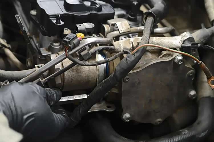 相比前面的项目,更换高压油泵密封垫就比较简易了。它位于机舱的驾驶员侧,这里却布置了进气道、电瓶、冷却液管路和一些线束,虽然要拆的东西不少,但难度都不大。