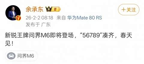 车家号·0浏览·2026-02-03 11:20 · 北京今日,鸿蒙智行官方发布了一则意味深长的预告视频,随后华为常务董事、终端BG CEO余承东在社交媒体上正式官宣:问界M6即将登场,今年春天见。