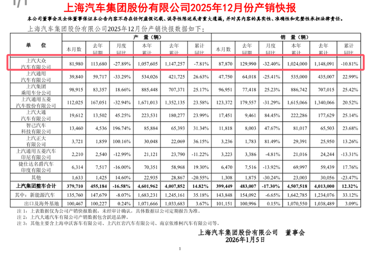 上汽集团最新产销快报数据显示,上汽大众在2026年开年第一个月销售新车68,402辆,同比下滑8.98%。显然,2026年1月份,上汽大众的单月销量并没有取得“开门红”的销量成绩。尤为值得注意的是,2026年1月份,上汽集团整体销量呈现出不错的上涨态势。