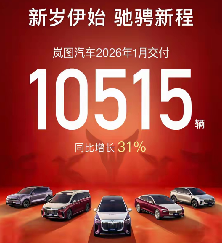 官方数据显示,2026年1月,岚图汽车交付10515辆,同比增长31%。这一数字已是岚图连续第三年实现1月销量增长。然而,与之形成反差的是,环比降幅却高达34.1%。显然,2026年1月份,岚图汽车的单月新车交付量呈现出“同比上涨、环比下滑”的市场态势。