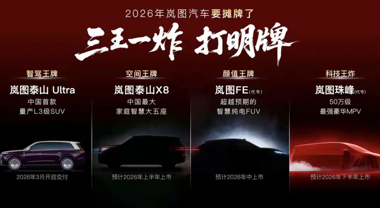 不过,好岚图已经制定了雄心勃勃的2026年产品规划。根据官方信息,岚图将在2026年推出四款全新车型,被内部称为“三王一炸”。