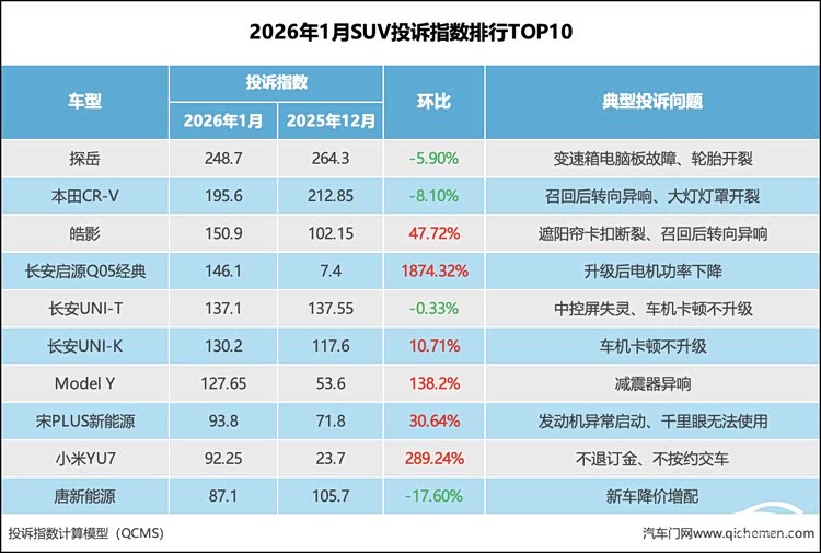 近日,汽车门网发布2026年1月SUV投诉指数排行。数据显示,汽车门网SUV车型的整体投诉指数为6464.55,环比下降16.76%。由于部分2025年12月上榜车型投诉指数下降并跌出榜单,因此2026年1月SUV车型整体投诉指数出现明显下滑。从2026年1月投诉指数排行来看,位列榜单前三的车型均为合资品牌车型。此外,长安汽车旗下三款车型上榜,比亚迪旗下两款车型上榜。其中, 长安启源Q05经典(参数|询价)投诉指数飙升近19倍,成为榜单中投诉指数上涨幅度最大的车型,位列榜单第四。升级后电机功率下降是该车型上榜的主要原因。