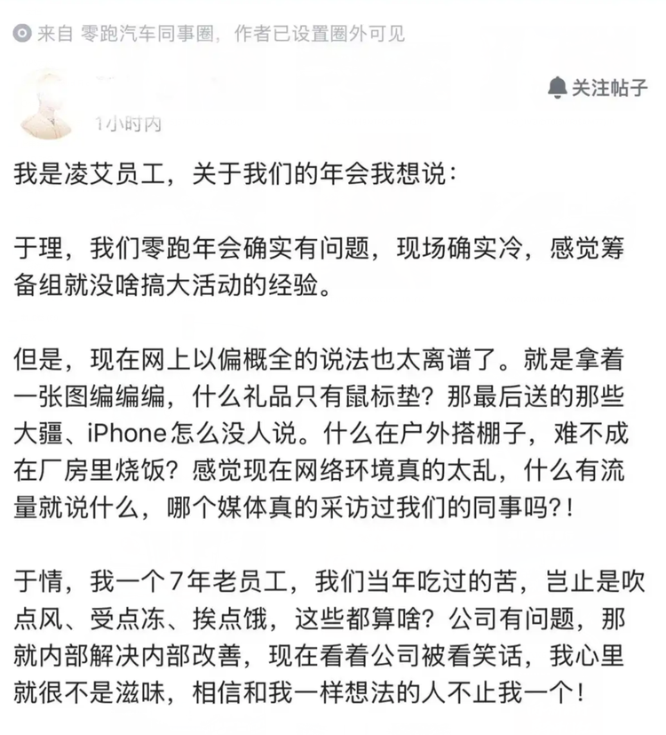 当然也有零跑员工站出来为企业站台,称现场确实冷,感觉筹备组没有什么搞大活动的经验;但是网上以偏概全的说法过于离谱,比如礼物只有鼠标垫,可是最后送的那些大疆、iPhone为什么没有人说?还说什么在户外搭棚子,难不成在厂房里烧饭?作为一个七年的老员工,当年吃过的苦岂止是吹点风、受点冻、挨点饿,这些都算什么?公司有问题,那就内部解决改善,现在公司被看笑话,心里很不是滋味……