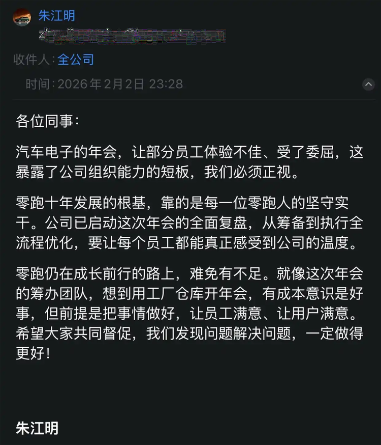 朱江明承认“拉胯年会”属实,并且承认公司组织能力存在需要正视的短板;零跑汽车已经启动年会的全面复盘,要让每个员工都真正感受到公司的温度。零跑仍在成长前行的路上,难免会有不足——等等描述没有推诿,也没有将责任推卸到相关部门,而是以零跑汽车为名承认了存在不足;客观上,零跑汽车确实还是一家年轻的企业,出现问题也是正常的,所以此次“拉胯年会”的话题也可以结束了。