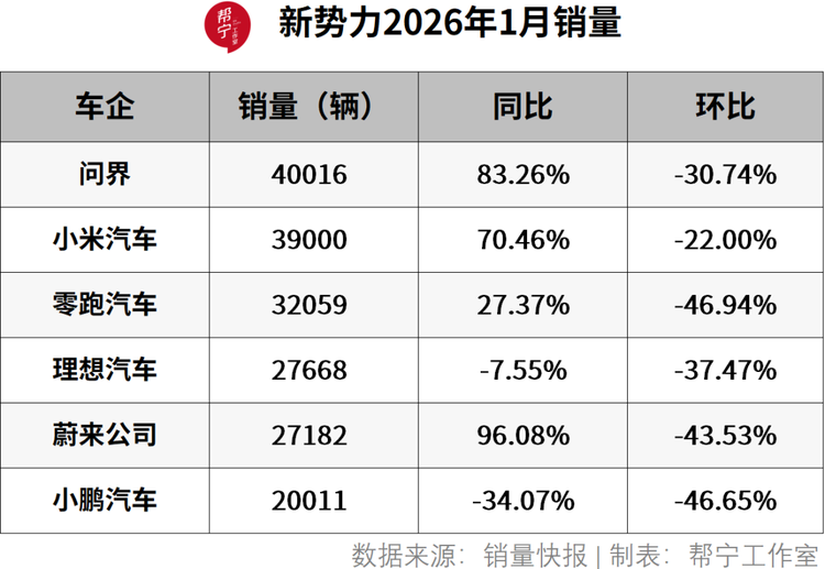 1月,造车新势力格局明显变化,头部领跑、两极分化,有的品牌凭借产品实力与市场布局高速增长,有的则面临销量下滑的压力。