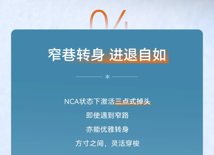此外,在智能导航巡航(NCA)功能激活的状态下,车辆现在支持在符合条件的路段执行三点式调头操作。当系统判断当前道路允许且安全时,可自动规划并执行这一系列转向动作,帮助车辆在无需人工接管的情况下完成调头,减轻驾驶员在狭窄或复杂路口环境下的操作负担。