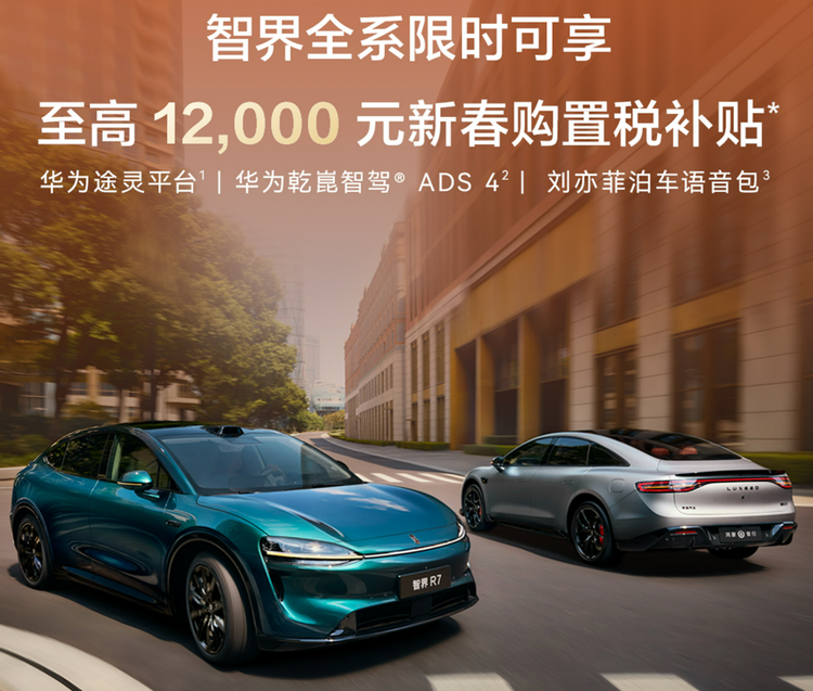 在2026年2月3日-3月2日购买智界全系车型,可享受至高12000元购置税补贴,另外可享以下权益: