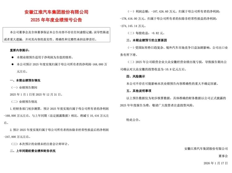 公告显示:江淮汽车(SH:600418)发布了2025年年度业绩预亏公告,预计2025年归属母公司所有者净利润亏损16.8亿元,同比减亏1.04亿元;扣非净利润预计亏损24.7亿元,同比减亏约2.71亿元。