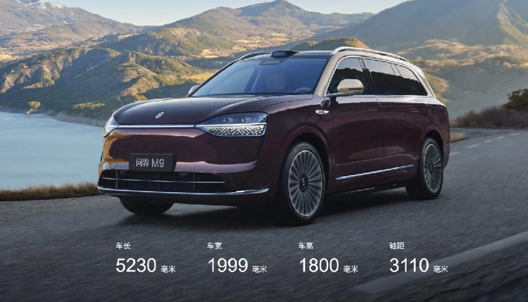 问界M9拥有5230mm*1999mm*1800mm的宽大车身与3110mm超长轴距。