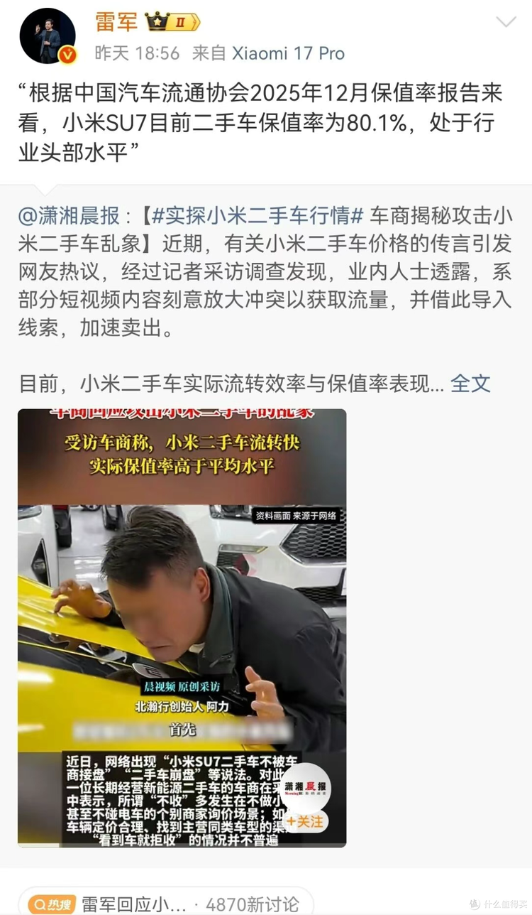 其实,权威机构的数据不会骗人,冷静一想就知道,车商卖惨多半是为了制造争议,好低价收车、再高价卖出。还有一个原因就是,曾经有段时间小米SU7的保值率非常高,二手准新车的价格甚至超过指导价,在上市初期这款车的提车周期长达20-24 周(约 5-6 个月),再加上这款车的热度很高,市场需求大,导致首批现车极度稀缺,最终导致0 公里准新车被炒到 32 万元 (比官方指导价高 2 万 +)。这种现象持续了大概半年,2025 年下半年起现车供应充足,提车周期缩短至 1-2 周,这种加价买二手车,二手车价格和新车价格倒挂的现象就没有出现了。之所以很多经销商抱怨是因为当初这款车确实是价格高,很赚钱,于是投机购买了不少车,但是如今保值率回到了正常水平,导致部分二手车商亏钱了,因此在网上抱怨。