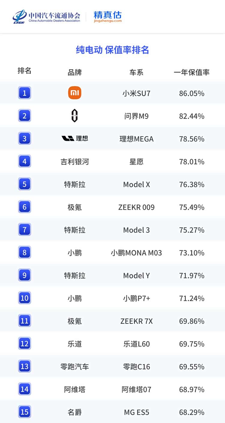 1月27日,中国汽车流通协会发布《2025年度中国汽车保值率报告》。在纯电动车型中,小米SU7以86.05%的一年保值率获2025年度保值率第一名,问界M9一年保值率为82.44%,仅次于小米SU7,排名第三的是理想MEGA,一年保值率为78.56%。此外,吉利银河星愿(78.01%)、特斯拉Model X(76.38%)、极氪009(75.27%)、特斯拉Model 3(75.27%)、小鹏MONA M03(73.1%)、特斯拉Model Y(71.97%)、小鹏P7+(71.24%)均跻身前十。