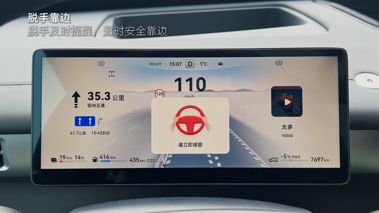 针对长途出行疲劳驾驶的问题,脱手靠边功能可以在驾驶员双手长时间脱离方向盘时,首先发出10秒接管提醒,若驾驶员未及时响应,车辆将主动控制车速平稳靠边停车,最大程度保障人车安全。